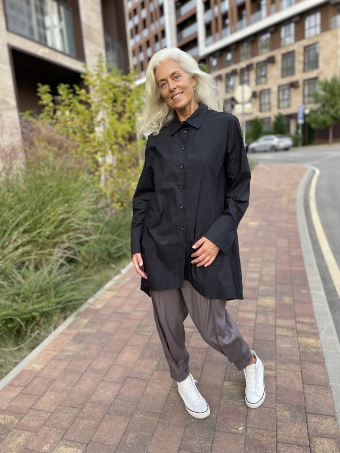Рубашка женская хлопковая в такой ткани подходит как для повседневной носки, так и для слоистых многослойных образов. Она отлично сочетается с брюками и жакетами MAZKA, вписываясь в базовый гардероб женщины 40+.