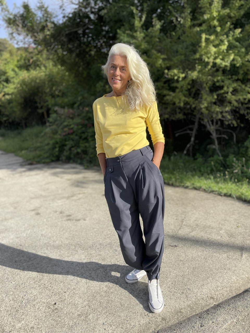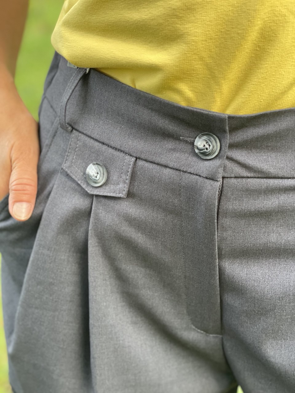 Пояс брюк широкий, с резинкой на спинке — благодаря чему модель комфортно садится на разные объёмы талии. А высокая посадка делает силуэт более стройным.