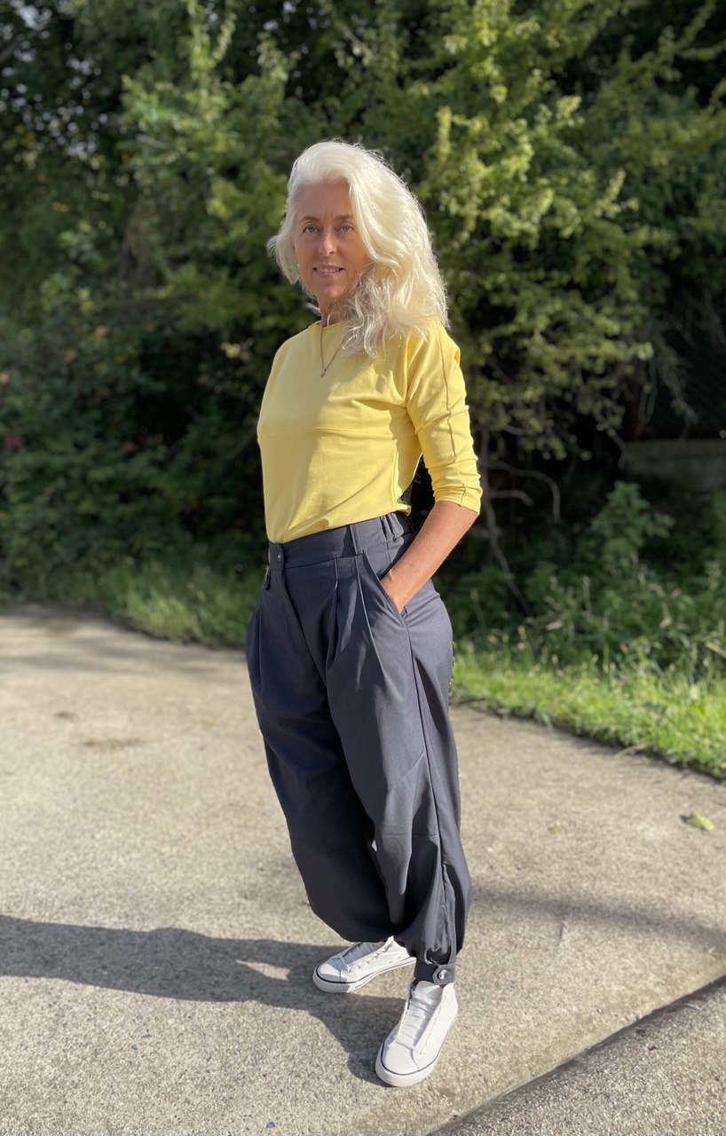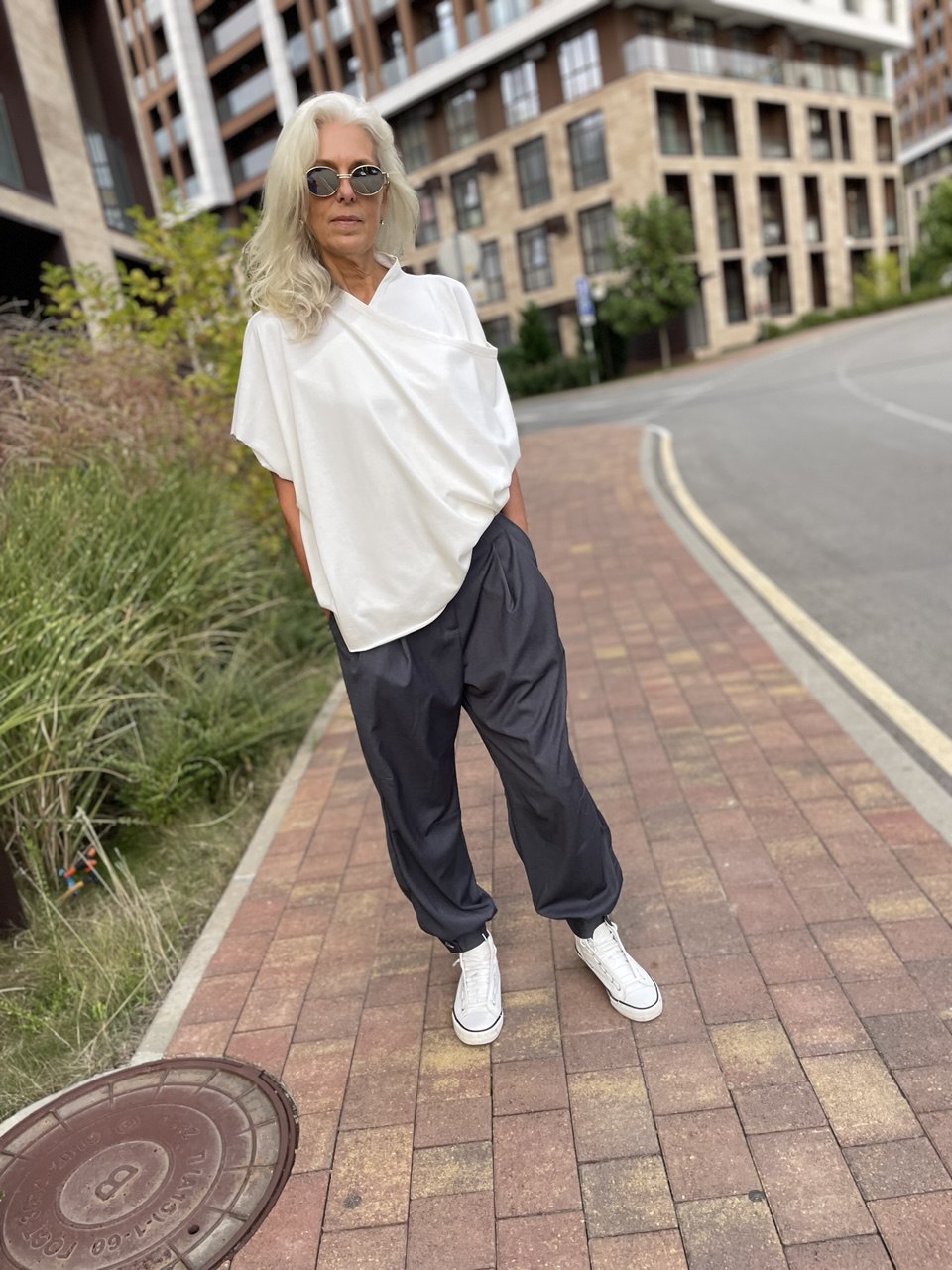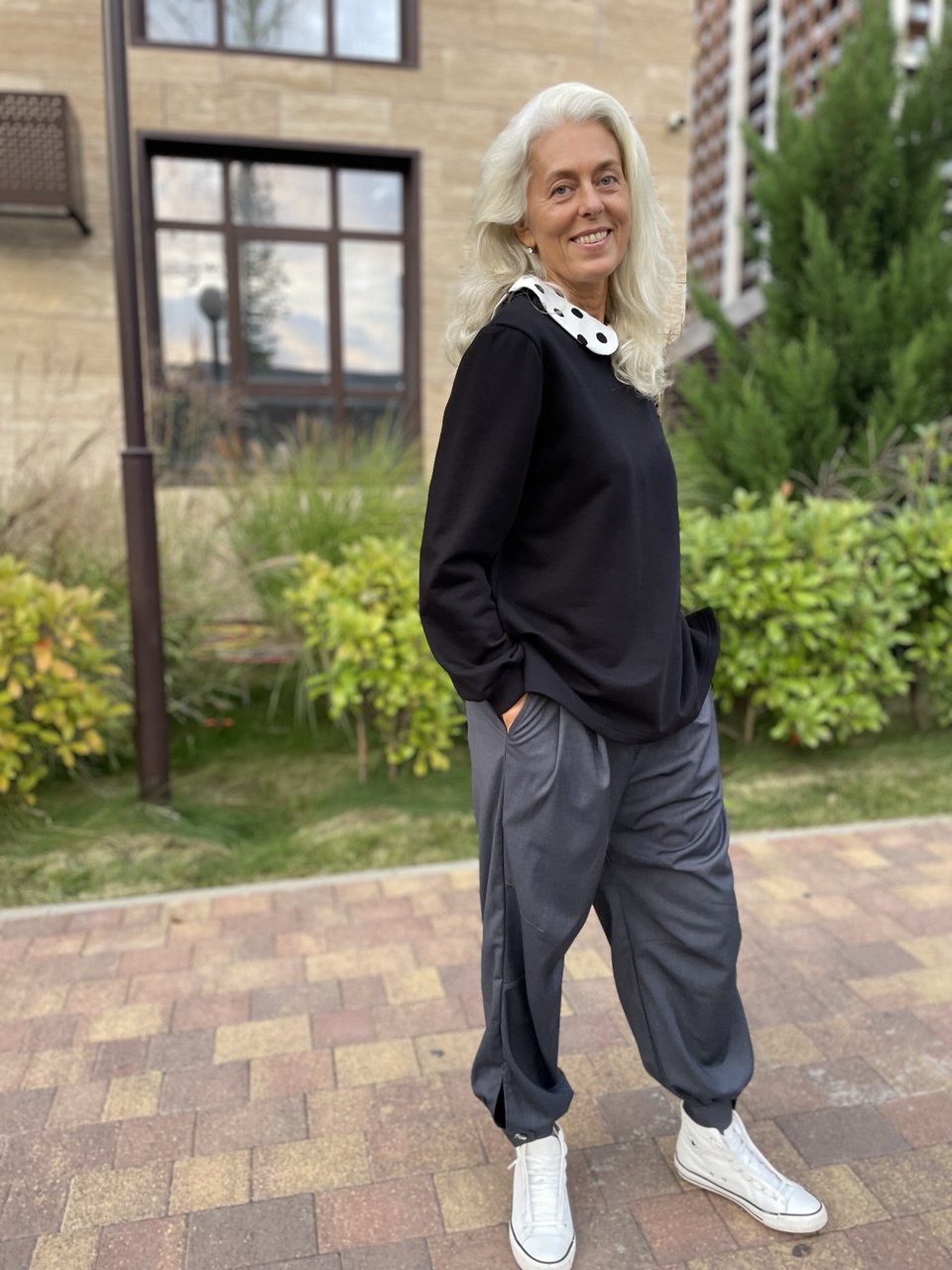 Мы постарались избежать излишнего оверсайза — эти брюки женские широкие на резинке дарят свободу движения, но не увеличивают объём. Манжет на штанине подчёркивает щиколотку и добавляет образу женственности и лёгкости. Это отличная альтернатива как офисным, так и повседневным моделям.