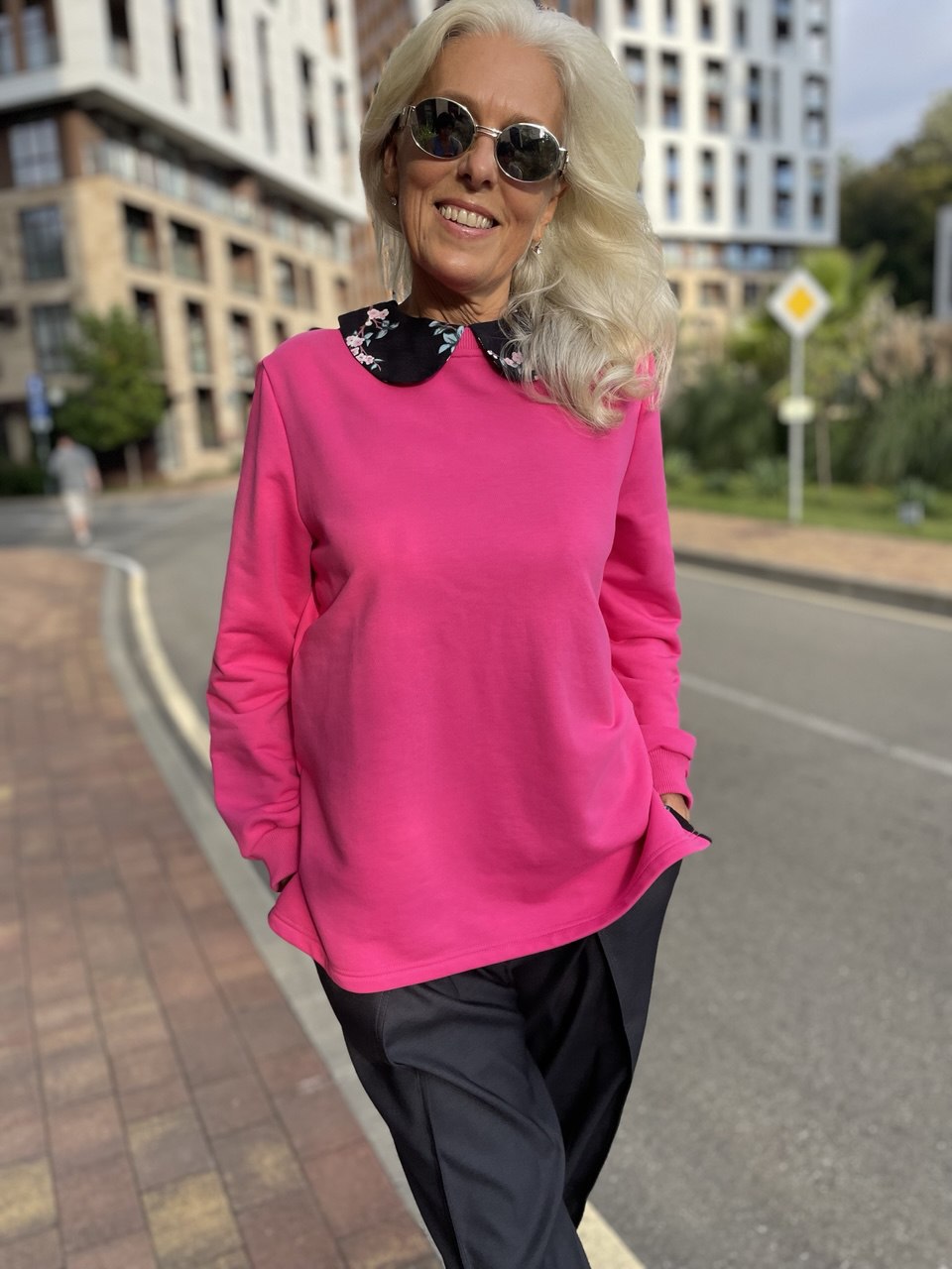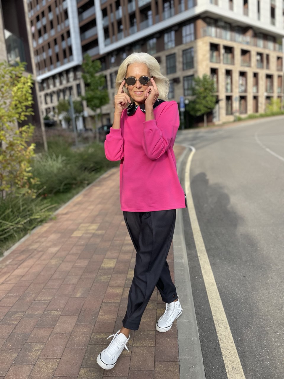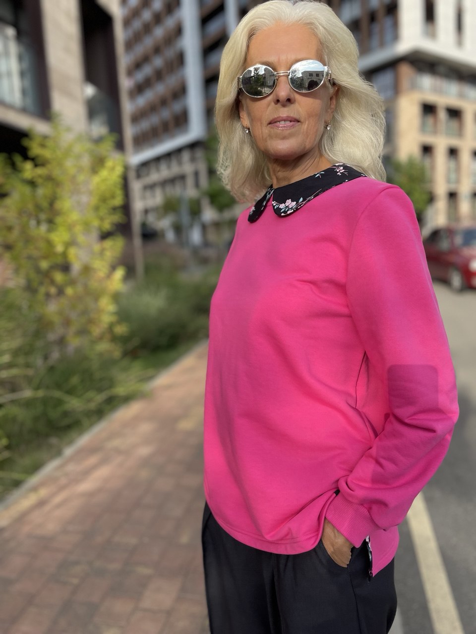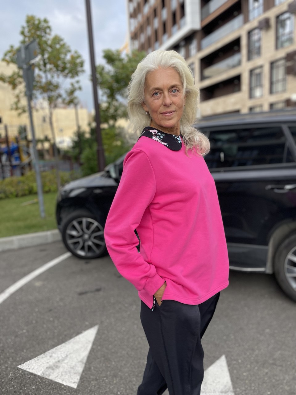 Именно таким получился наш новый женский свитшот с воротником, он же — удлинённая толстовка и худи женское без капюшона. Модель оверсайз, но аккуратная, не утяжеляющая силуэт, с продуманной посадкой и эффектом «минус 5 лет» за счёт деталей.