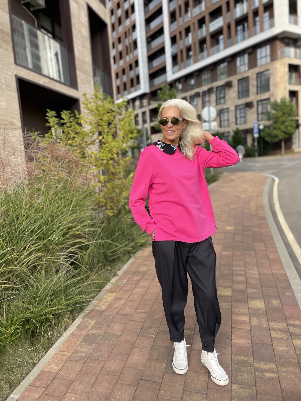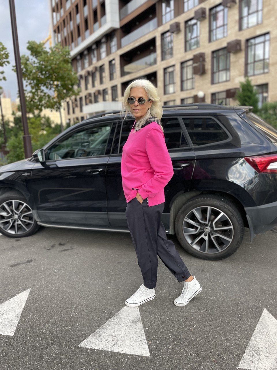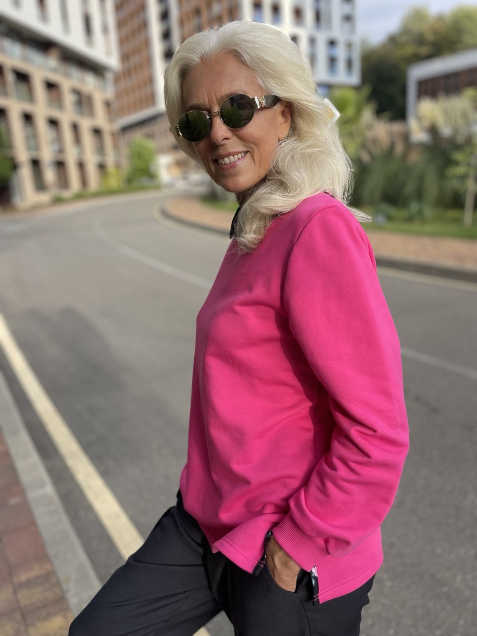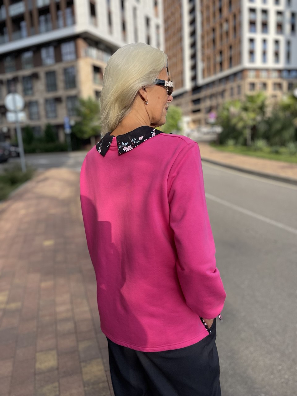 Именно таким получился наш новый женский свитшот с воротником, он же — удлинённая толстовка и худи женское без капюшона. Модель оверсайз, но аккуратная, не утяжеляющая силуэт, с продуманной посадкой и эффектом «минус 5 лет» за счёт деталей.
