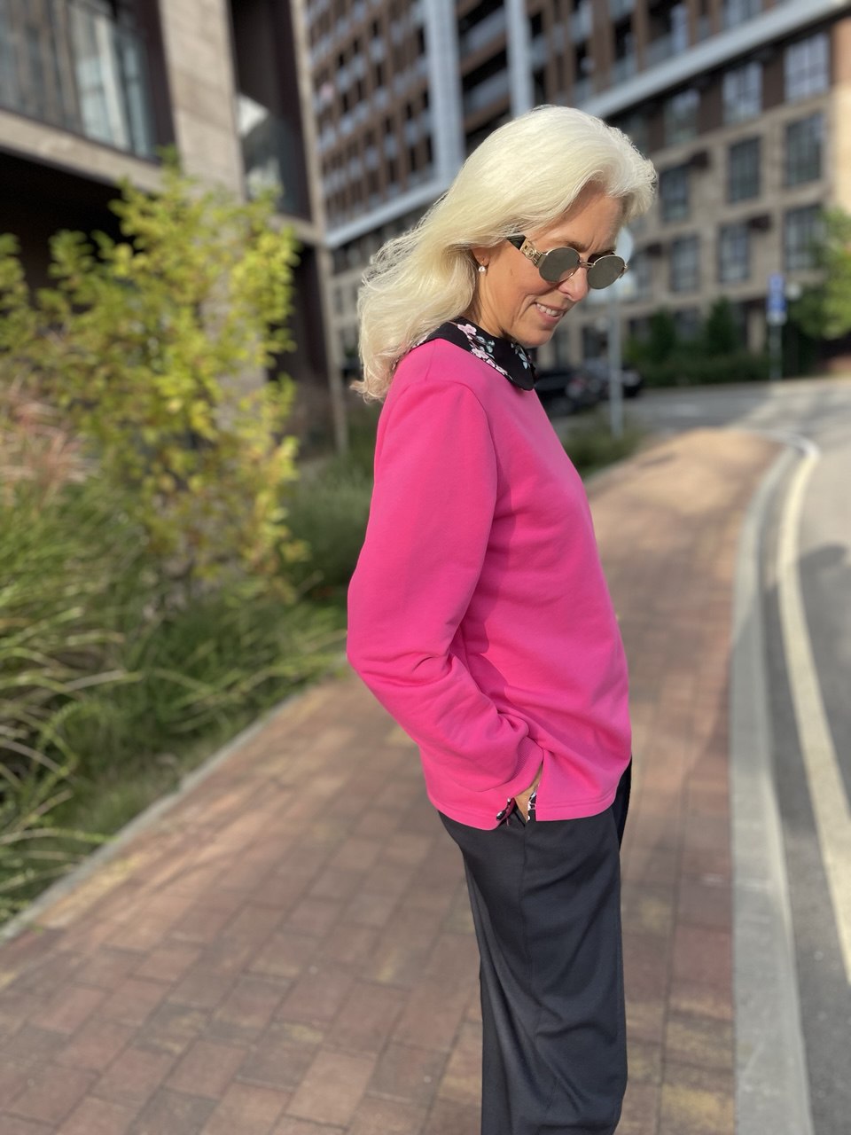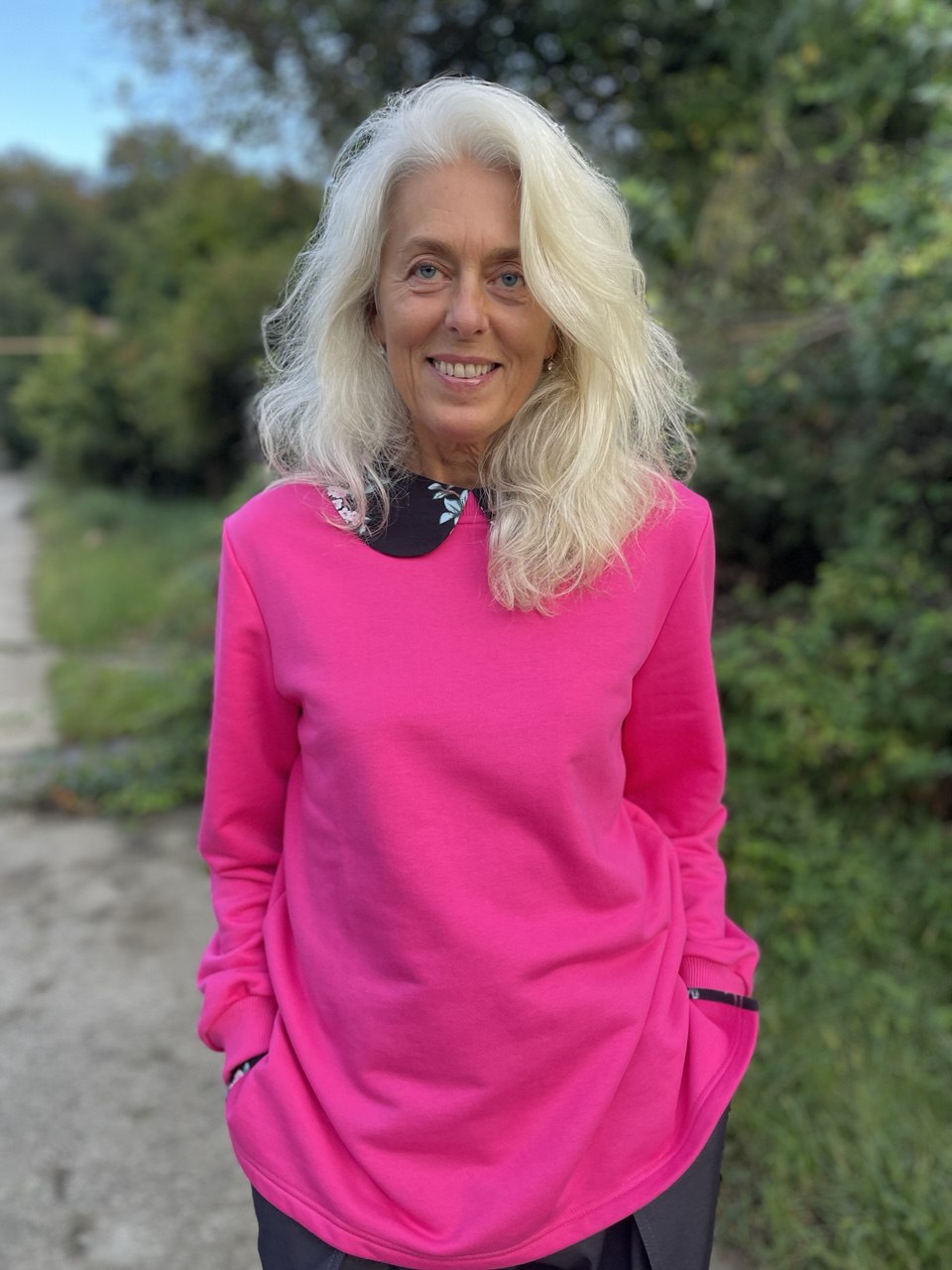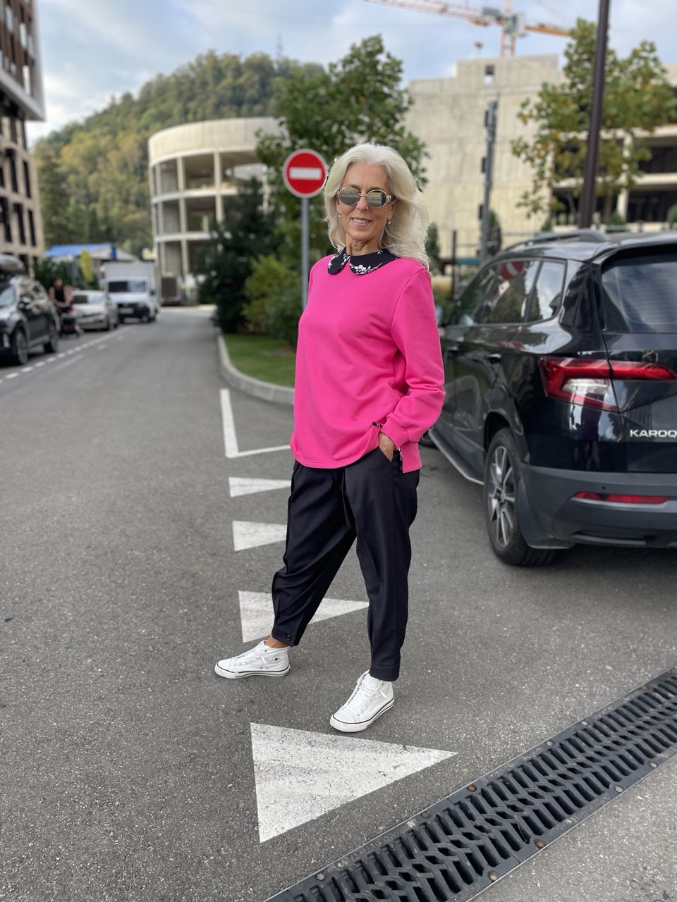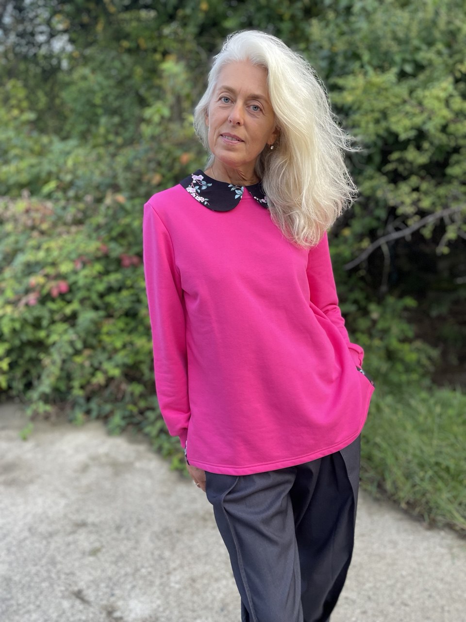 Именно таким получился наш новый женский свитшот с воротником, он же — удлинённая толстовка и худи женское без капюшона. Модель оверсайз, но аккуратная, не утяжеляющая силуэт, с продуманной посадкой и эффектом «минус 5 лет» за счёт деталей.