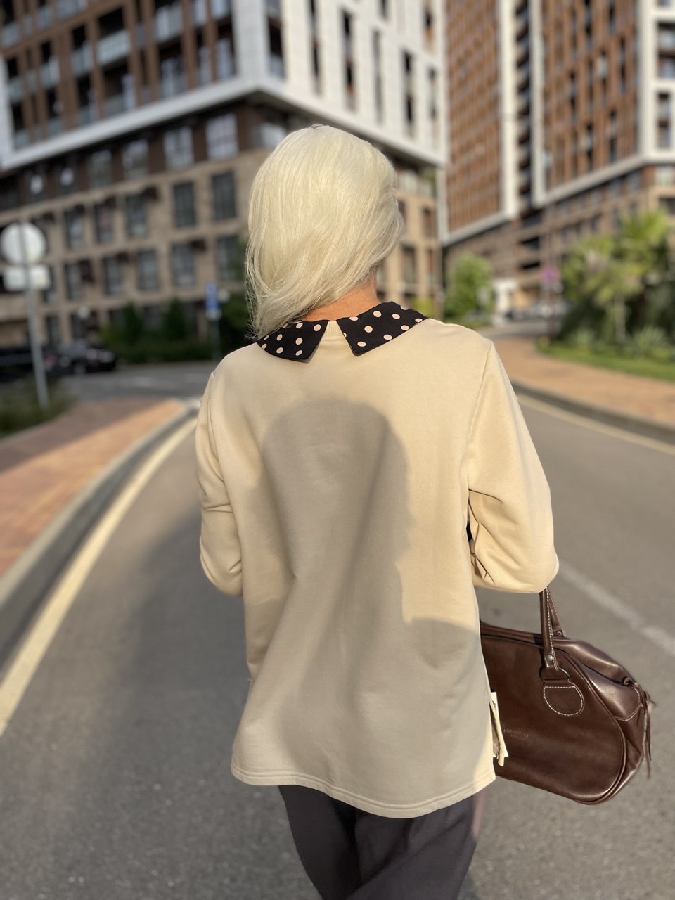 Свитшот женский оверсайз удлинённый модный дополнен съёмным воротником, который крепится на кнопки и легко снимается.